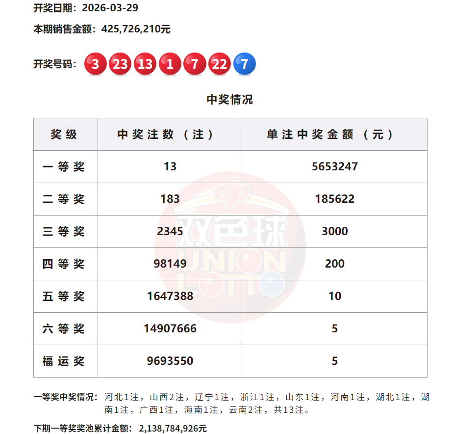 当期双色球一等奖中出13注,分落河北1注、山西2注、辽宁1注、浙江1注、山东1注、河南1注、湖北1注、湖南1注、广西1注、海南1注、云南2注,单注奖金565万元。