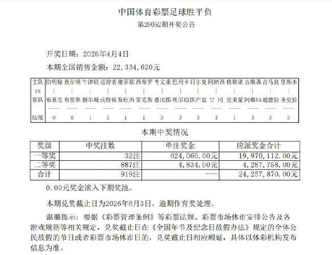 北京时间4月4日,胜负彩第26052期开奖结果揭晓。本期足彩头奖共开出32注,单注奖金624,066元。二等开出887注,单注奖金4,834元;任选九场开出7853注,单注奖金1,340元。本期胜负彩销量为22,334,620元,任九投注总额为16,446,822元。