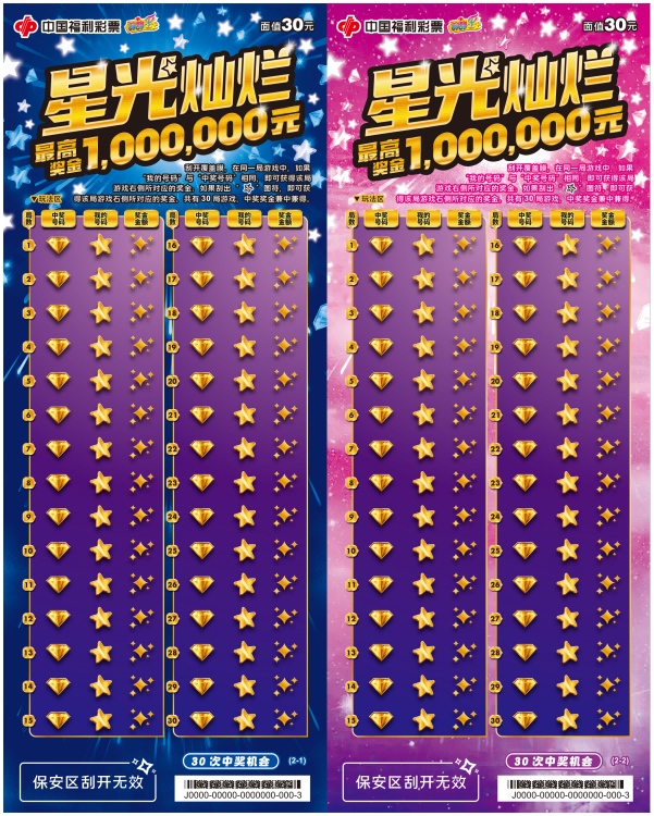 福彩刮刮乐30元新票“星光灿烂”近期于天津上市。本套彩票共2张,票面以深邃夜空为基底,璀璨星光错落辉映、光影层次立体,搭配鎏金星星与钻石符号,营造出梦幻闪耀的视觉氛围。票面时尚精致,尊贵大气,彰显荣耀与财富。
