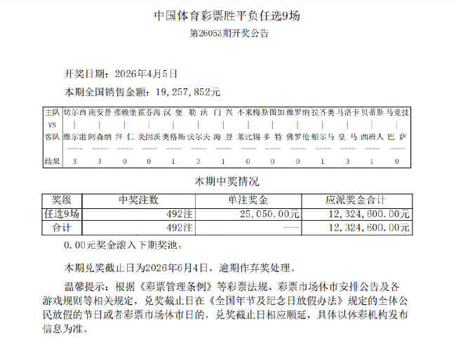 北京时间4月4日,胜负彩第26052期任九开奖结果揭晓。本期任九开出492注,单注奖金25,050元。本期任九投注总额为19,257,852元。