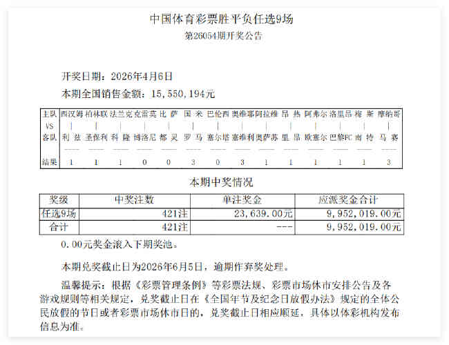北京时间4月6日,胜负彩第26054期开奖结果揭晓。14场头奖空开,滚存增至786万;14场2等开出15注,单注奖金17.6万;任九开出421注,单注奖金23639元。本期14场销量为13,755,664元,任九投注总额为15,550,194元。
