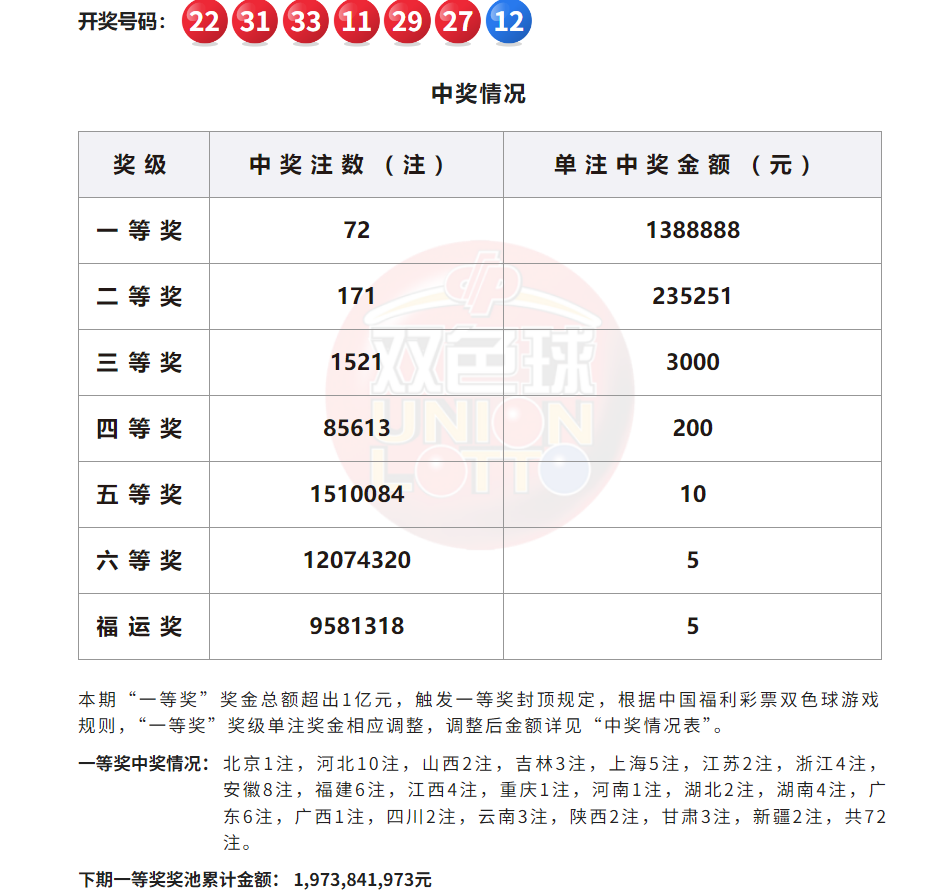 此外,因开奖前奖池高于15亿,增设5元福运奖(命中3枚红球即中奖),共开出9581318注。