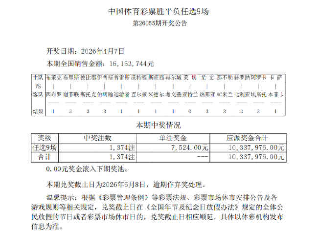 北京时间4月7日,胜负彩第26055期开奖结果揭晓。本期任选九场开出1,374注,单注奖金7,524元。本期任九投注总额为16,153,744元。