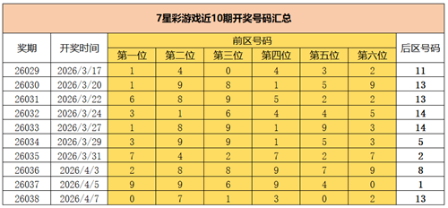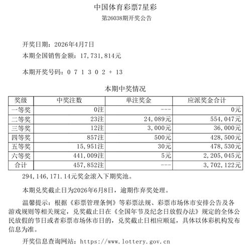 2026年4月7日晚,中国体育彩票7星彩第26038期开奖,当期开奖号码为前区“0 7 1 3 0 2”,后区“13”。