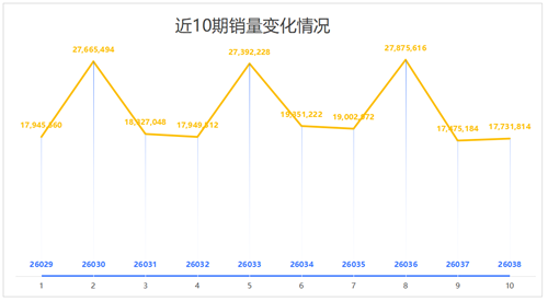7星彩第26038期当期销量为17,731,814元。相比上一期(第26037期)销量增加256,630元,增幅达到1.47%。