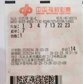3月29日晚,中国福利彩票双色球第2026034期开奖,红色球号码为01、03、07、13、22、23,蓝色球号码为07。当期全国共开出一等奖13注,单注奖金5,653,247元,其中1注一等奖花落海南。
