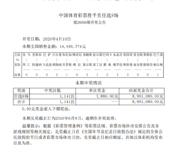 北京时间4月10日,足彩第26056期任九开奖结果揭晓。任九开出1141注,单注奖金7880元。本期任九投注总额为14,049,774元。