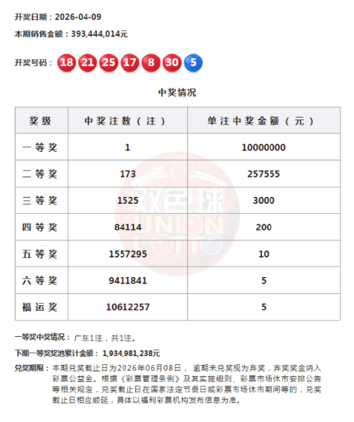 22:10 本期一等奖开出1注,单注奖金1000万,落于广东。二等奖开173注,单注奖金25万余元;5元福运奖开出10612257注。
