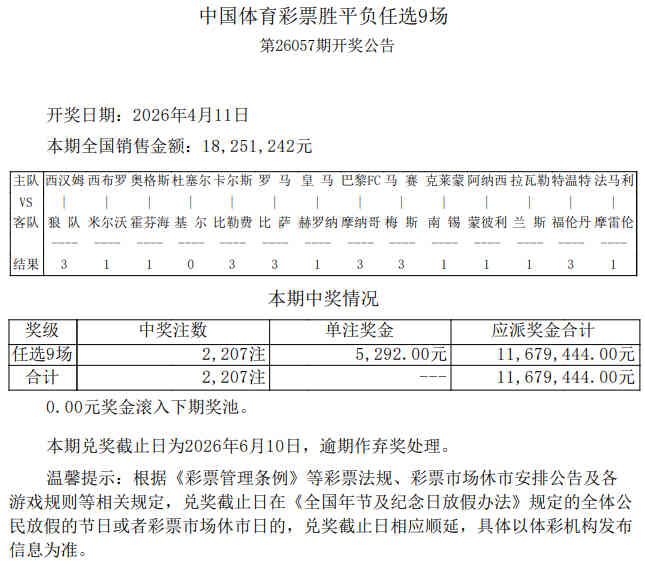 北京时间4月11日,足彩第26057期任九开奖结果揭晓。本期任九开出2207注,单注奖金5292元。本期任九投注总额为18,251,242元。