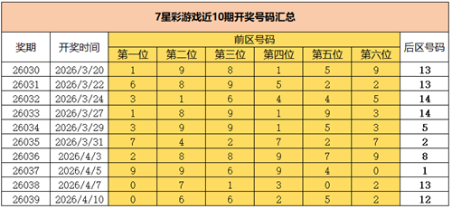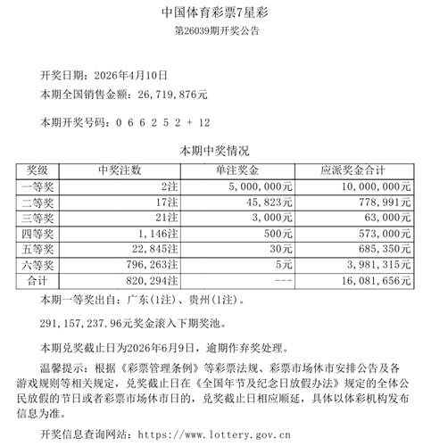2026年4月10日晚,中国体育彩票7星彩第26039期开奖,当期开奖号码为前区“0 6 6 2 5 2”,后区“12”。