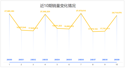 7星彩第26039期当期销量为26,719,876元。相比上一期(第26038期)销量增加8,988,062元,增幅达到50.69%。当期销量出现大幅增长,是时间节点、消费心理、开奖周期共同作用的结果。周五是工作日收尾、周末开启的节点,群众休闲意愿与消费热情显著提升,购彩自然成为衔接工作与休闲生活的轻松选择。同时,7星彩周二、周五、周日开奖,周二至周五间隔3天,购彩者的期待感得以充分积累,购彩意愿与单次购彩金额投入相应提高。加之周五社交场景丰富,购彩话题传播更广,进一步带动销量增长。