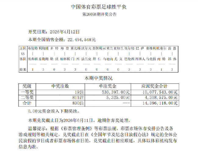 北京时间4月12日,足彩第26058期开奖结果揭晓。本期足彩一等奖共开出19注,单注奖金530,397元;二等奖开出811注5325元;任九开3205注4306元。本期14场销量为22,494,548元,任九投注总额为21,566,560元。