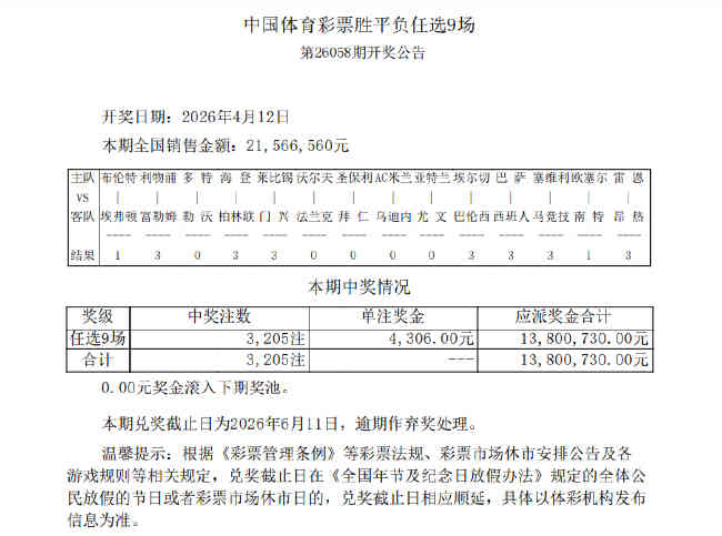 北京时间4月12日,足彩第26058期任九开奖结果揭晓。本期任九开出3205注,单注奖金4306元。本期任九投注总额为21,566,560元。