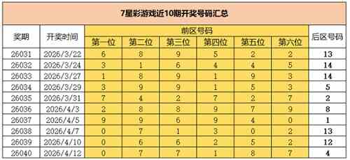 2026年4月12日晚,中国体育彩票7星彩第26040期开奖,当期开奖号码为前区“0 7 7 1 8 7”,后区“4”。
