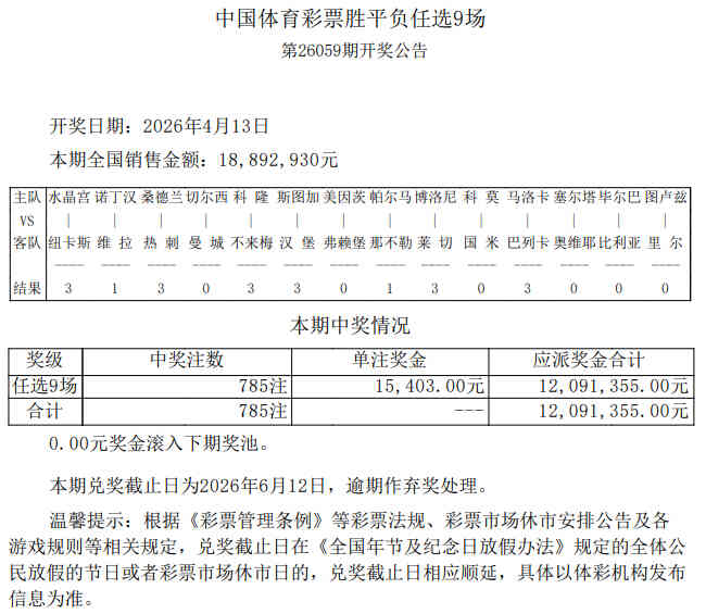 北京时间4月13日,胜负彩26059期任九开奖结果揭晓。本期任九开出785注,单注奖金15,403元。本期任九投注总额为18,892,930元。