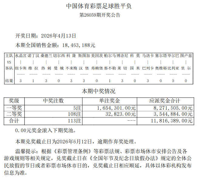 北京时间4月13日,胜负彩26059期开奖结果揭晓。本期一等奖仅开出5注,单注奖金165万元;二等奖开出108注32,823元;任九开785注15,403元。本期足彩销量为18,463,188元,任九投注总额为18,892,930元。