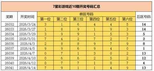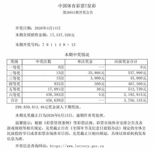 2026年4月14日晚,中国体育彩票7星彩第26041期开奖,当期开奖号码为前区“7 9 1 1 4 9”,后区“13”。