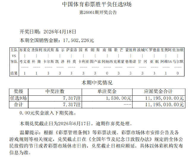 北京时间4月18日,胜负彩第26061期开奖结果揭晓。本期任九开7317注1530元。本期任九投注总额为17,502,226元。