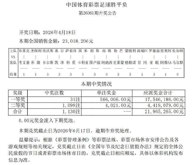 北京时间4月18日,胜负彩第26061期开奖结果揭晓。本期足彩一等奖开31注,单注奖金566,006元,7,234,032.51元滚存被清空;二等奖开出1099注4021元;任九开7317注1530元。本期14场销量为23,018,206元,任九投注总额为17,502,226元。