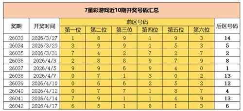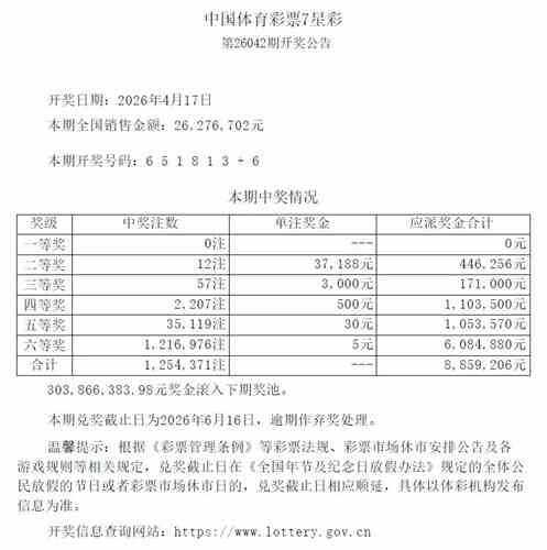 2026年4月17日晚,中国体育彩票7星彩第26042期开奖,当期开奖号码为前区“6 5 1 8 1 3”,后区“6”。