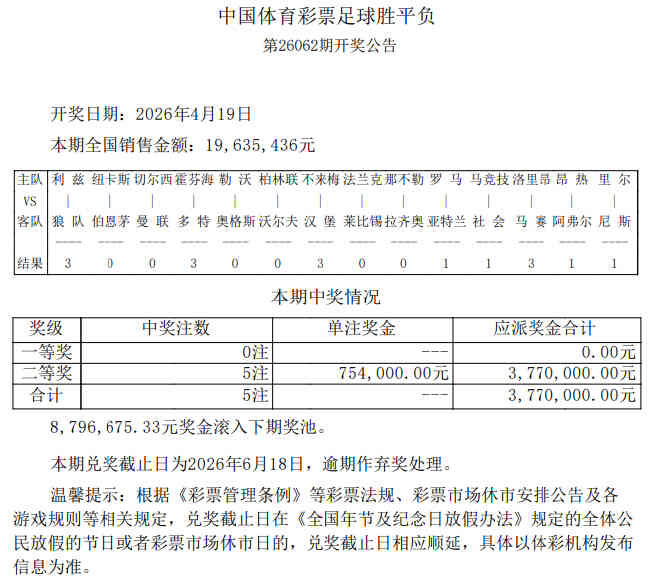 北京时间4月19日,胜负彩第26062期开奖结果揭晓。本期足彩冷门频出,14场仅有4场比赛打出首赔。以致于本期一等奖空开,二等奖仅开5注754,000元,8,796,675.33元奖金滚入下期奖池。任九开出24注,单注奖金506,090元。本期胜负彩销量为19,635,436元,任九投注总额为18,978,384元。