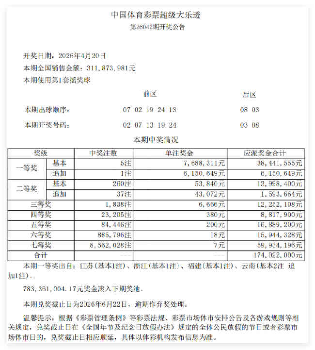 北京时间4月20日晚,体彩大乐透第26042期开奖,当期开奖号码为前区02 07 13 19 24,后区03 08。