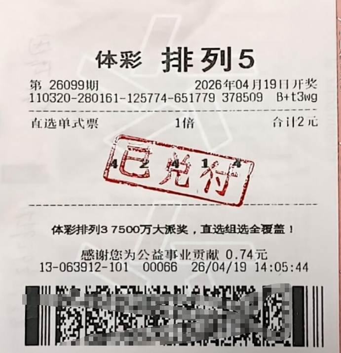 4月19日,体彩排列5第26099期如期开奖。在宿迁沭阳县七雄镇,一位购彩者袁先生凭借一张仅花费2元的直选单式票,精准匹配了当期开奖号码,成功揽获一等奖,奖金高达10万元。
