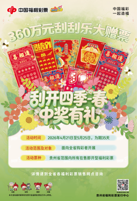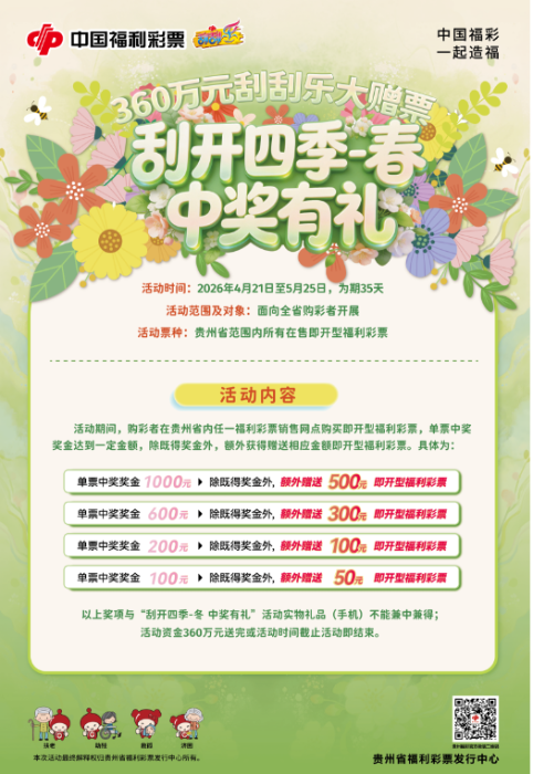 为回馈广大购彩者一直以来对福利彩票事业的支持,贵州福彩“刮开四季-春 中奖有礼”360万元刮刮乐赠票活动于4月21日正式开始!活动内容如下: