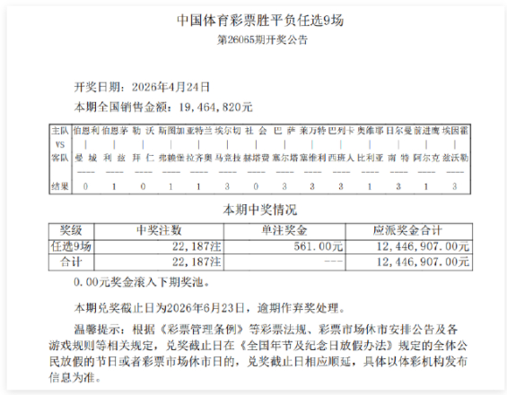 北京时间4月24日,足彩第26065期任九开奖结果揭晓。本期任九开22187注561元。本期任九投注总额为19,464,820元。