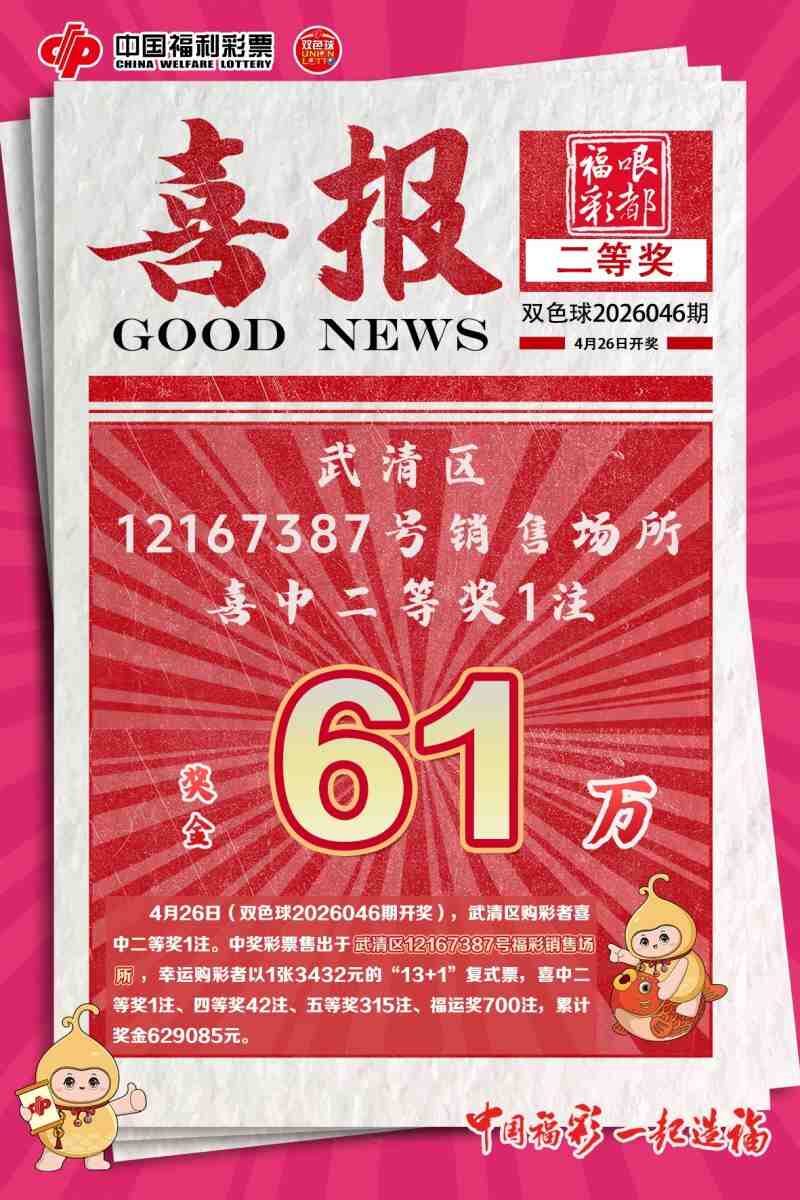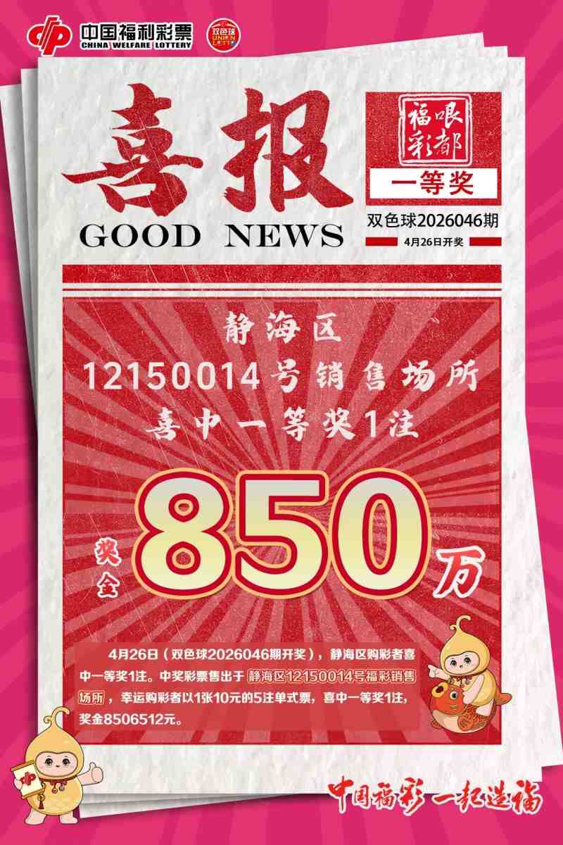 喜讯传来!4月26日,双色球第2026046期开奖结果揭晓,天津的购彩者再次收获好运,斩获双色球一等奖!