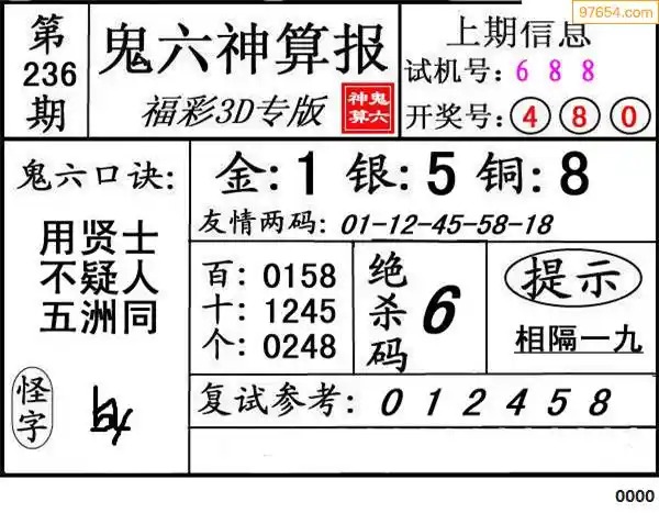 上一篇:23235期: 福彩3D鬼六神算图
