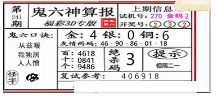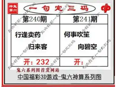上一篇:23240期: 福彩3D鬼六神算图