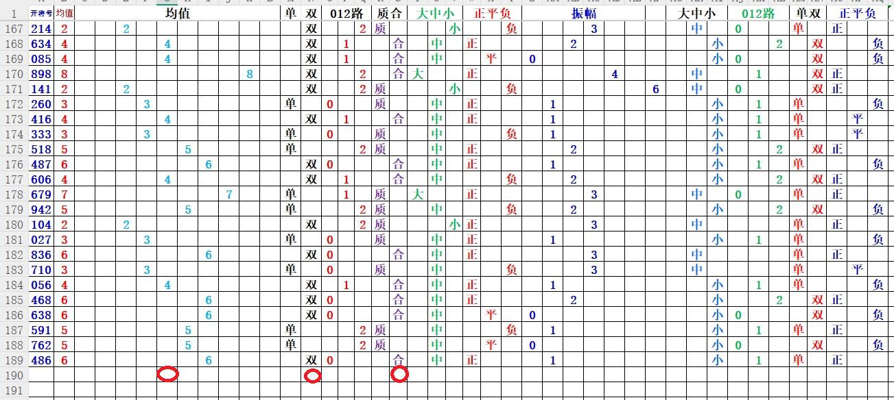 均值:就是开奖号每各数的总和除3,然后得到的余数,如果不够整除可以+1,-1,直到被整除得的数就是均值
