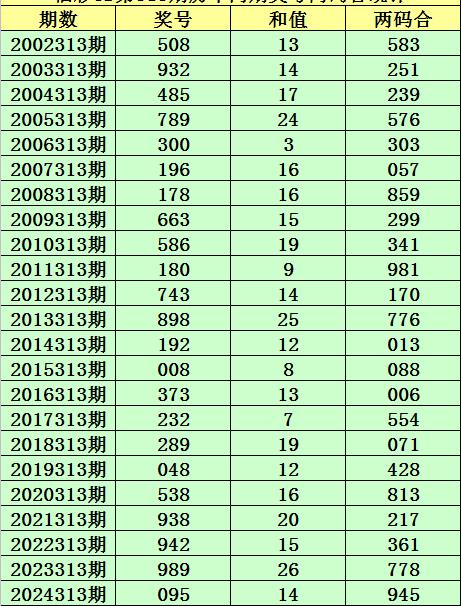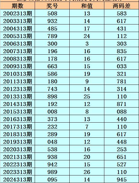 福彩3D第313期,历史上期开出23次奖号,其奖号分别为:508、932、485、789、300、196、178、663、586、180、743、898、192、008、373、232、289、048、538、938、942、989、095,奖号两码合差分别开出: