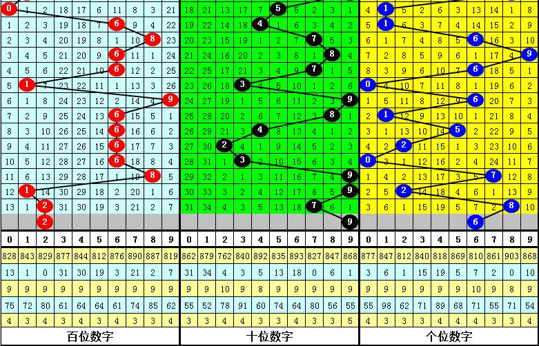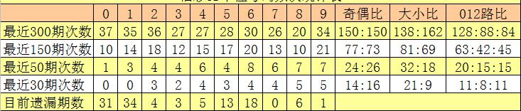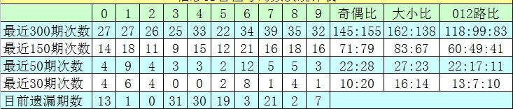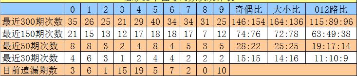 十位分析:前50期出号频次较高的号码为:6开出8次,8、9开出7次;出号频次较低的号码为:0开出1次,1开出3次,2、3、5开出4次。该位号码大小比为32:18,012路比为20:15:15。本期该位排除两码0、3,注意号码2、5、9,精选一码9。