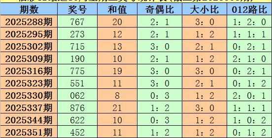 福彩3D第2025351期(上周星期三)奖号为452。其中奖号奇偶比为1:2,大小比为1:2,012路比为0:1:2。