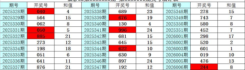 上期回顾:福彩3D第2026006期奖号为:244,其中奖号组选类型为:组三,奇偶比为0:3,大小比为0:3,012路比为0:2:1,和值为10,跨度为2。