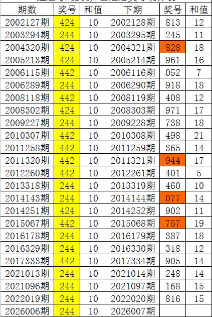 一、上期回顾:福利彩票3D第2026006期开奖结果:奖号为244,奖号和值为:10,奖号跨度为:2。