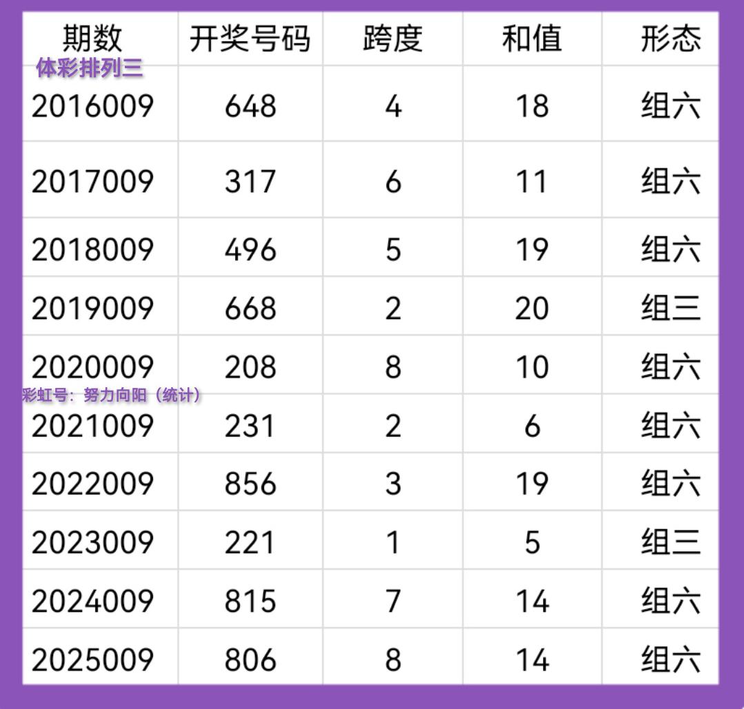 一:依据往年十期号码,我们先来分析三位出号范围以及跨度和值范围: