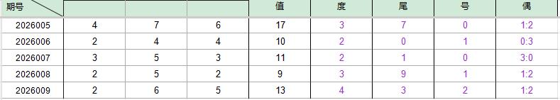 2026005期开奖号码476,我们可以看出近30期百位4出现2次,十位7出现5次,个位6出现4次。
