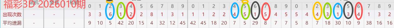 2026009期开奖号码265,我们可以看出近30期百位2出现6次,十位6出现1次,个位5出现3次。