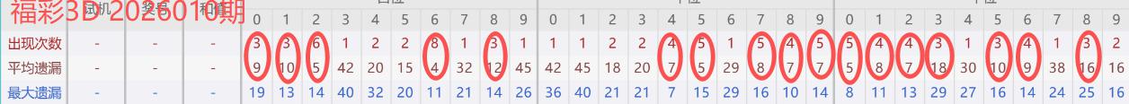 2026007期开奖号码353,我们可以看出近30期百位3出现1次,十位5出现4次,个位3出现3次。