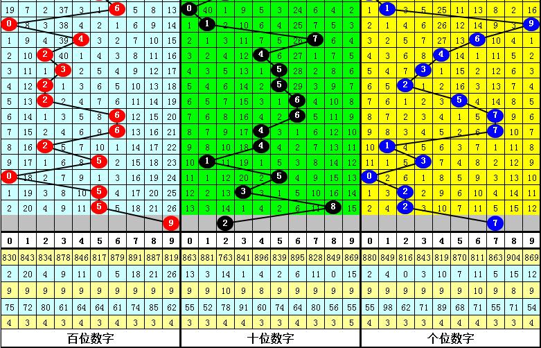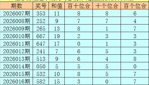 百个位合:前10期百个位两码合开出:6、4、7、3、3、3、8、0、7、7,其中百个位两码合012路比为5:4:1,奇偶比为6:4,本期看好百个位两码合开出0路号,参考两码合3、6、9。
