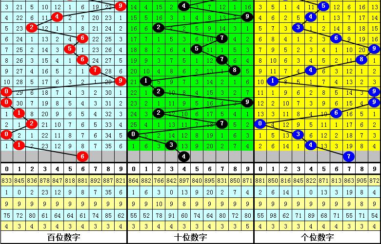 从以上统计可以看出,百十位两码合差4与2同时出现之后其下期两码合差表现最热的4个分别为:0123,本期百十位两码合差可以参考这四码中的数据。