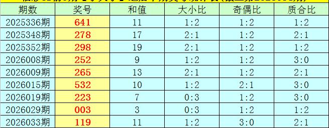2、奖号质合比分别开出:2:1、2:1、2:1、3:0、3:0、1:2、0:3、2:1、2:1,总质合比开出17:10,其中有5期奖号质合比和上期奖号质合比相等;
