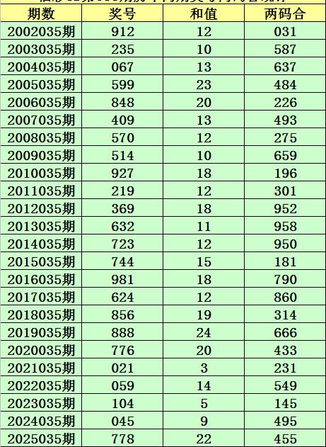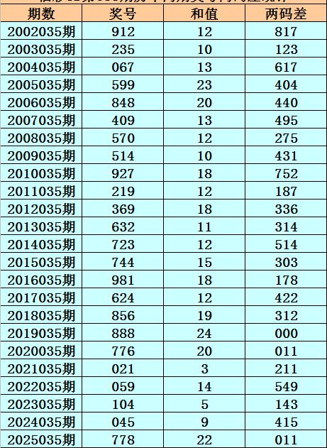 福彩3D第035期,历史上期开出24次奖号,其奖号分别为:912、235、067、599、848、409、570、514、927、219、369、632、723、744、981、624、856、888、776、021、059、104、045、778,奖号两码合差分别开出: