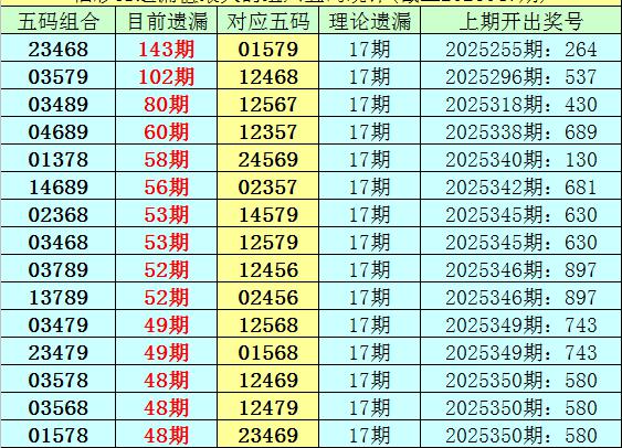 4.截止第26047期,五码组六遗漏最大的是:23468,当前遗漏143期。短期解冻的可能性较小,则26048期奖号分布在23468-01579之中的可能性最大。