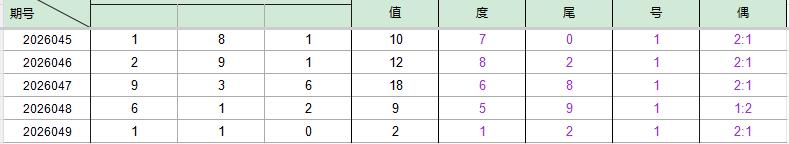 2026045期开奖号码181,我们可以看出近30期百位1出现5次,十位8出现3次(较046期减一),个位1出现3次。
