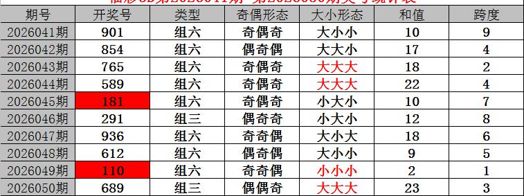 上期回顾:福利彩票3D第2026050期开奖结果689。奖号:偶偶奇、大大大,和值23,跨度3。