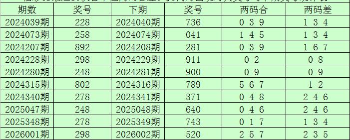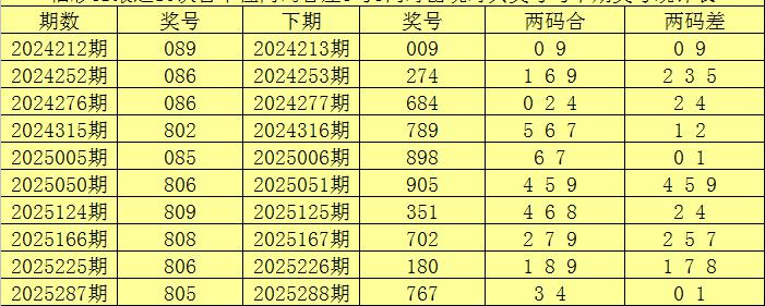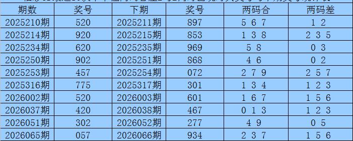 从以上统计可以看出,十个位两码合差2与2同时出现之后其下期两码合差表现最热的4个分别为:1235,本期十个位两码合差可以参考这四码中的数据。